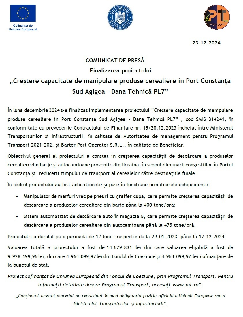 " Creștere capacitate de manipulare produse cerealiere în Portul Constanta Sud - Dana Tehnică PL7 "