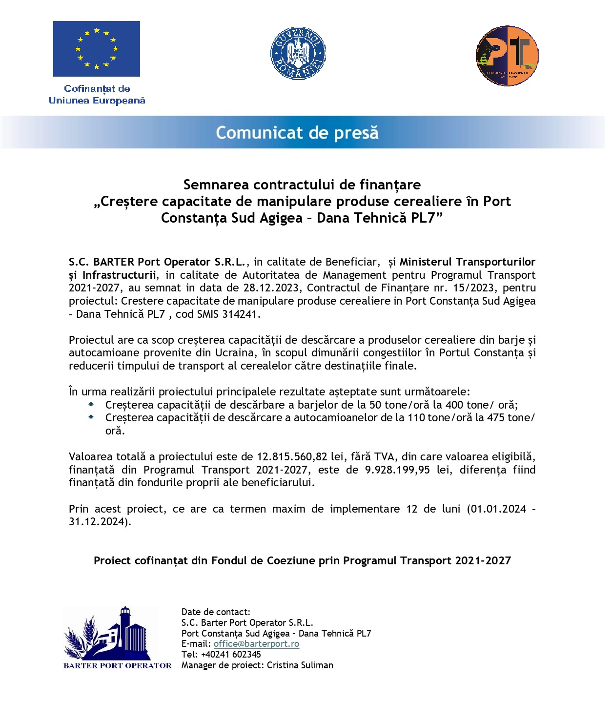 " Creștere capacitate de manipulare produse cerealiere în Portul Constanta Sud - Dana Tehnică PL7 "